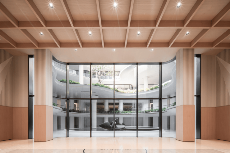 Y形布局使得三座塔楼围合成向心关系。以景观中庭为枢纽,规划两条“生机环线”:外环连接滨水绿带、垂江步行走廊、铁路文化步廊与开放街区;内环“生机之环”通过中庭整合采光、景观与流线,联通园区内外及各楼层功能空间。