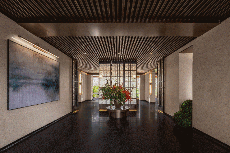 这次项目交付,一脉相承的安缦酒店式东大门,同样让人震撼。两道景墙层层过滤喧嚣,两棵罗汉松分列两侧,搭配丰富花木,构成归家动线的仪式感。