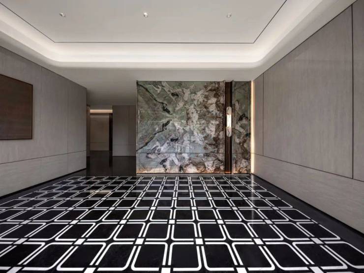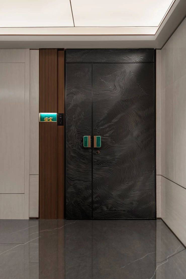 首层电梯门也特别做了定制细节处理,使用金属蚀刻工艺,高定专属纹案,近看能摸到细腻的凹凸质感;电梯厅内采用维多利亚绿奢石和温德姆灰石材打造,匹配类独厅设计的归家尊仪。