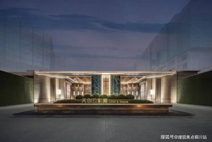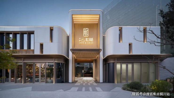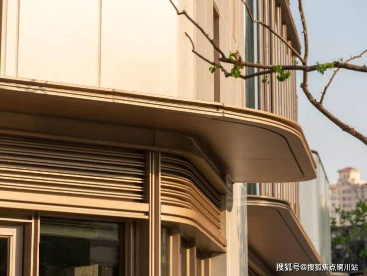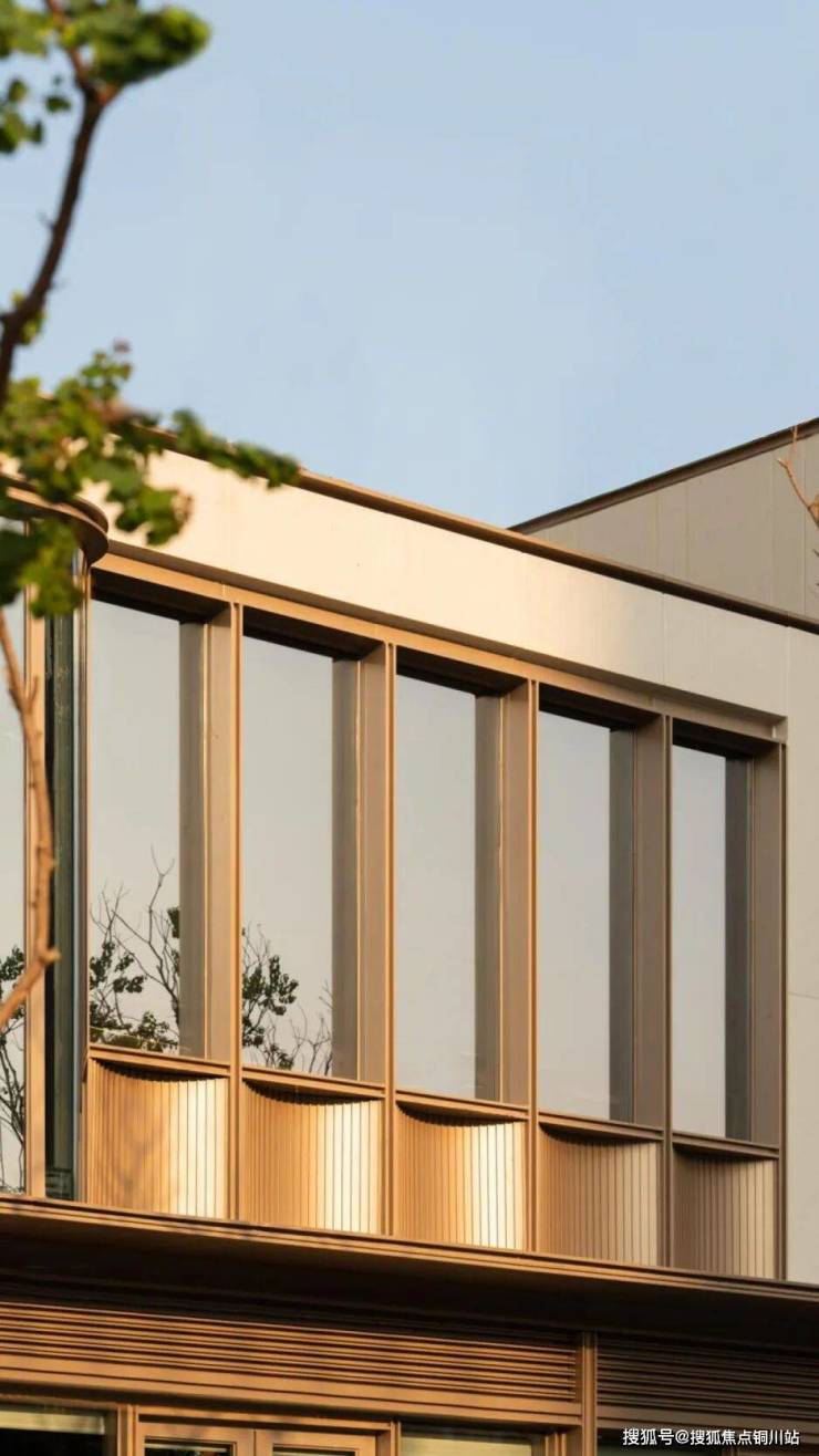 售楼处立面层次丰富,采用米白色铝板与香槟色金属型材为主,形成立面层次丰富,错落有序的矩形外立面形象。入口出采用竖向格栅飞檐的形式,精准把控立面元素和材质色彩的韵律变化及和谐统一。既突出对建筑细部美学的极致追求,又强化售楼处入口出的低调奢隐的氛围。
