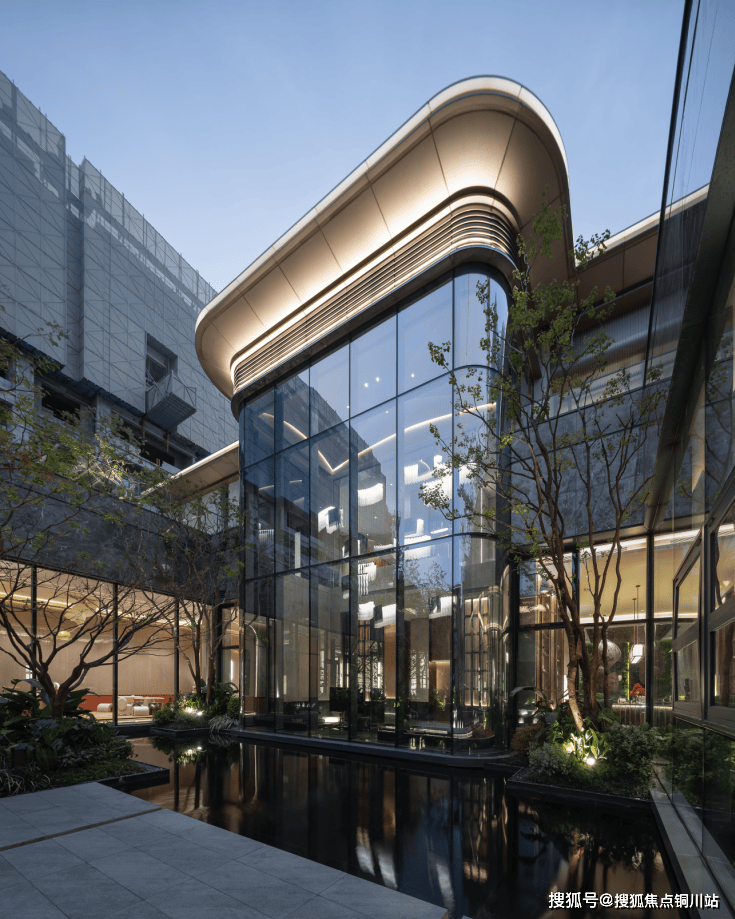 下沉庭院采用三面玻璃幕墙和一面石材台阶瀑布的做法,三面玻璃幕墙最大化保证地下会所的采光效果,一面水幕瀑布作为视觉景观重点打造的部位,弱化庭院的地下感,丰富庭院的趣味性。