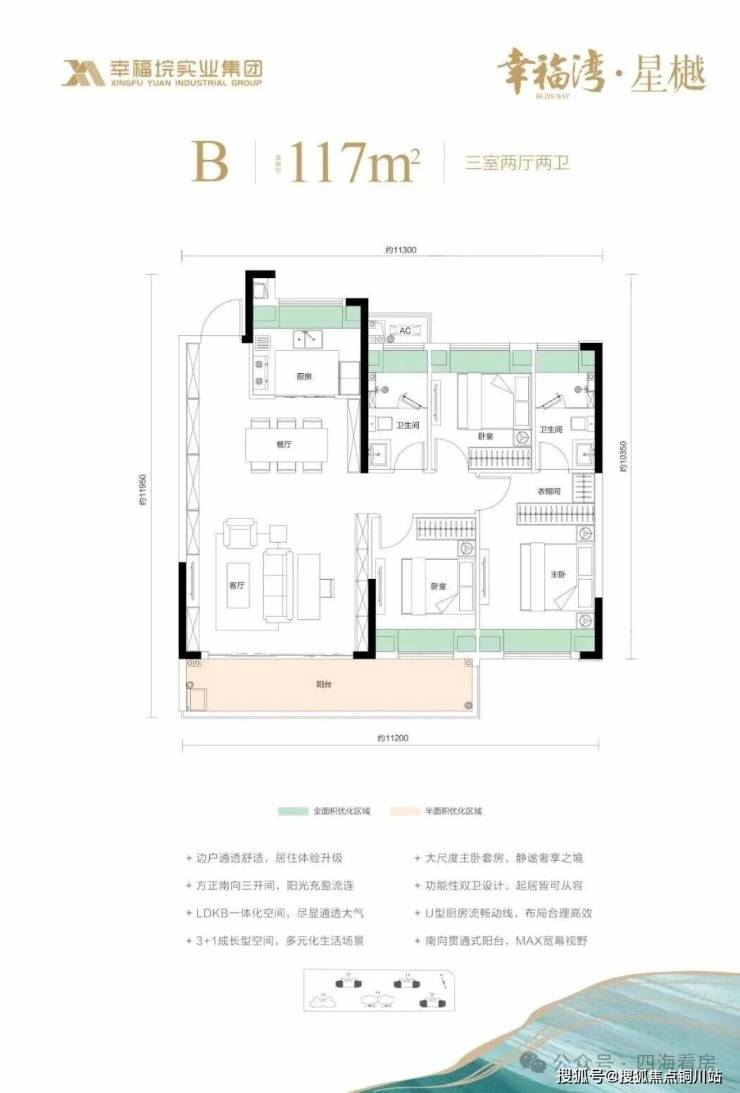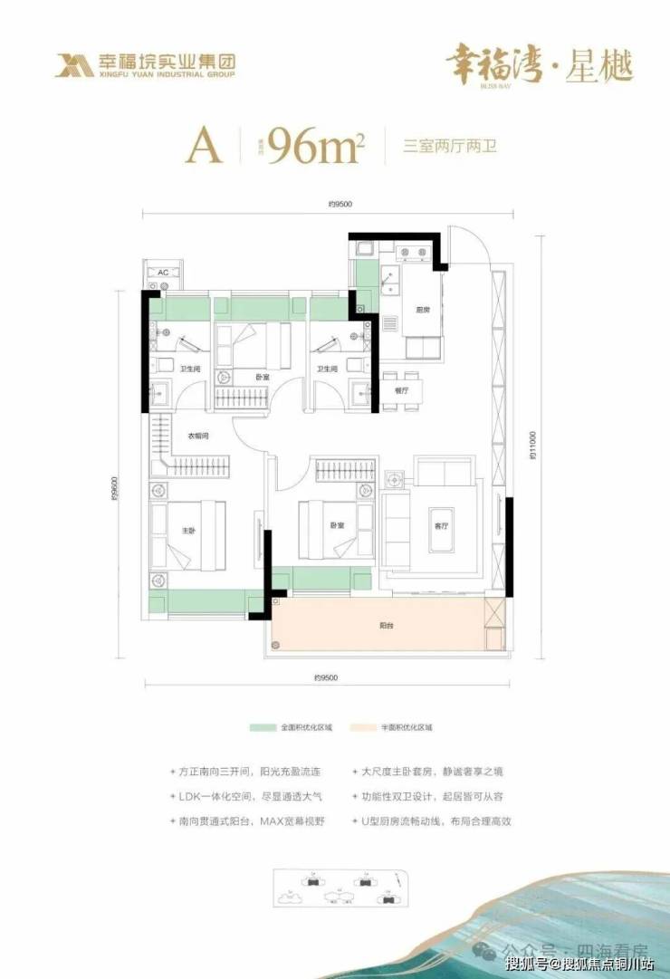 1、优化后空间使用率最高约97%;2、方正南向三开间;3、LDKB一体化空间;4、南向贯通式阳台;5、大尺度主卧套房;6、功能性双卫设计;7、U型厨房流畅动线。
