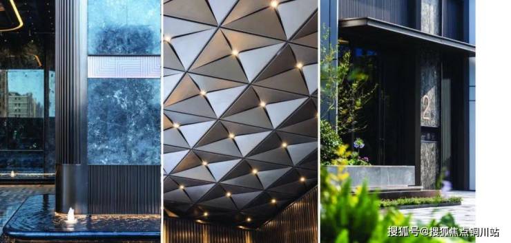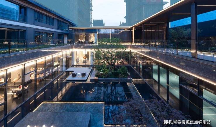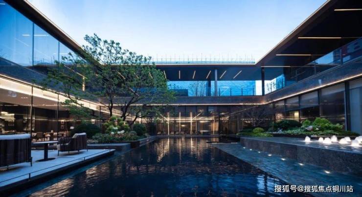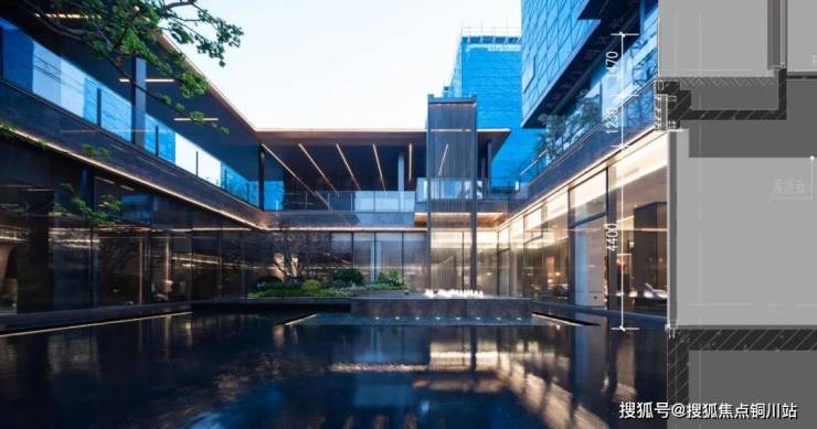 下沉式庭院巧妙布局了一片广阔的景观水域,象征着“将江水引入园中”,其周围环绕着清澈透明的玻璃幕墙和质感独特的黑耀灰大理石墙面,形成一幅宁静而庄严的景象。