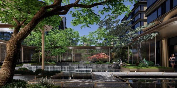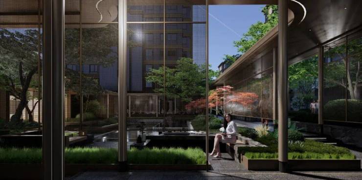 从对面玻璃门走出归家大堂、进入园区,迎面而来的是一片礼序水院。