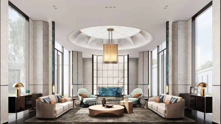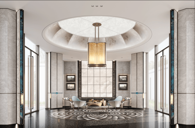 墙面则是大面积素色石材,更加凸显出接待台后玉石背景墙的精致。