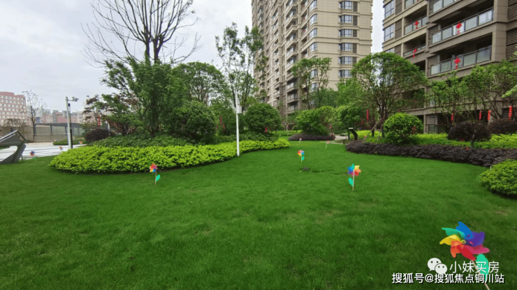 整个园区有两个大草坪,其中一个位于景观亭后面,另一个位于楼栋之间,两块大草坪草量很充沛,看着绿油油的,上面还有不少的绿植组团。