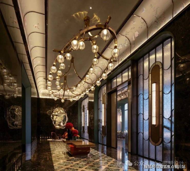 会所大堂是艺术与功能完美结合的典范。一盏如巨型珍珠项链般的吊灯自穹顶倾泻而下,它不仅是震撼的视觉焦点,更是空间的主要环境光源。