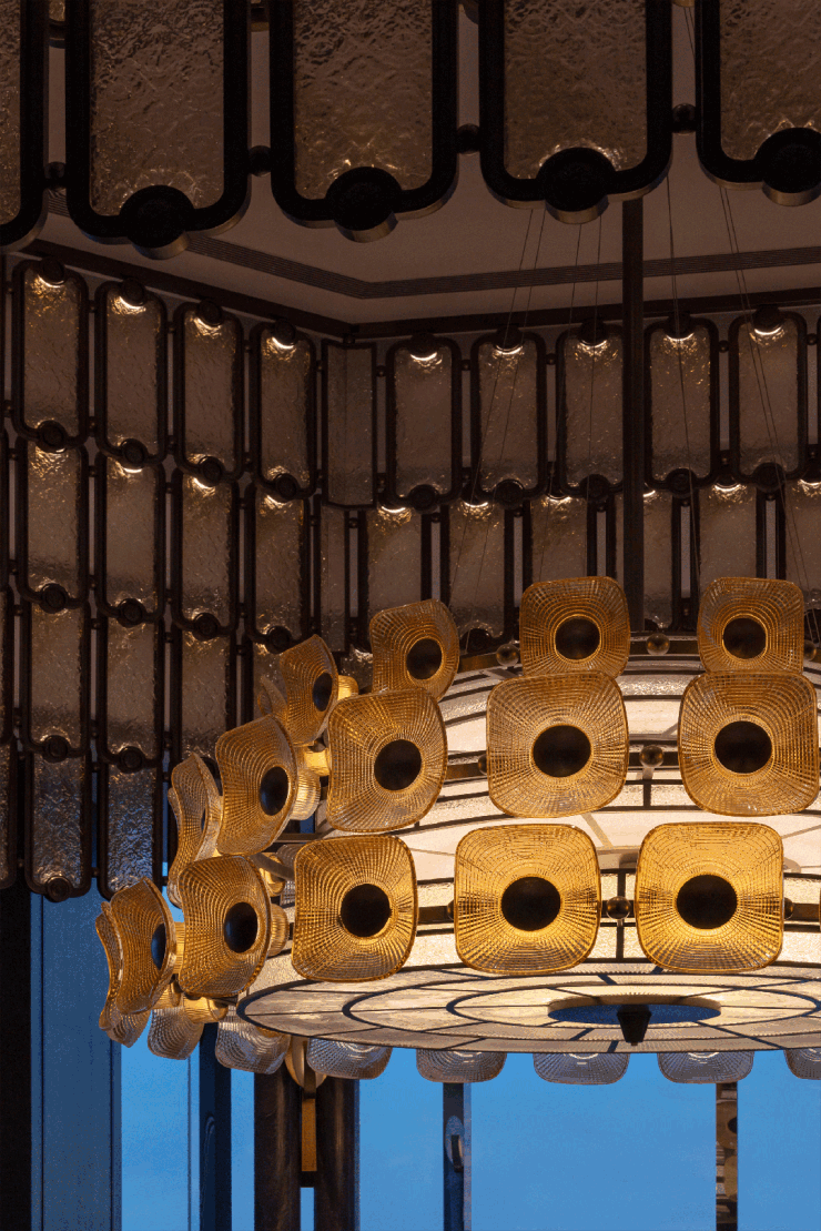 沿蜿蜒动线深入,直面江景的私宴包厢依次呈现。最大的包厢内,奢石立柱围合出八角亭格局,一盏三重琉璃凤翎灯悬于正中。光线穿过琉璃,被过滤、折射,在空间内铺陈开庄重而富有韵律的光影画卷。