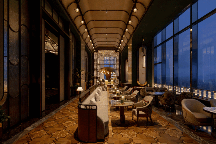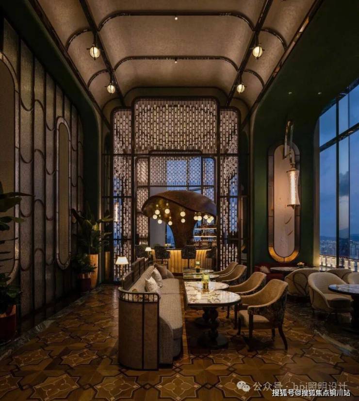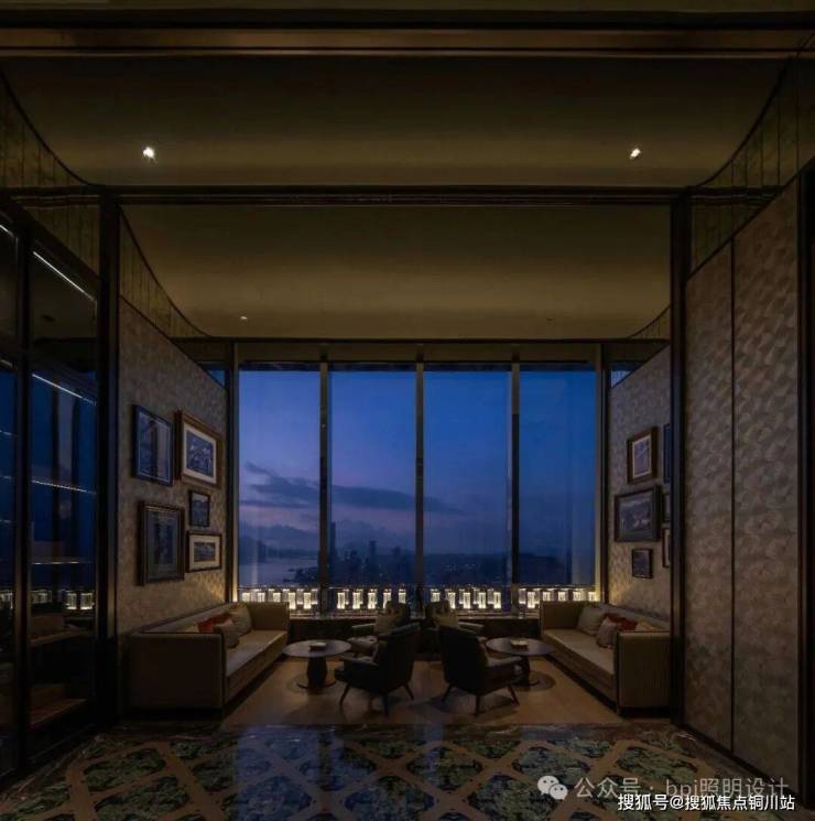 特殊角度的灯光轻抚着“瓯陶”墙面,使其呈现出温润如玉的质感;地面的拼花纹理在光线下清晰展现细腻之美;而如水流波动的曲线窗棱,其光影也随之起伏,与窗外瓯江的韵律遥相呼应。这些区域的光照被刻意压低,引导视线自然落于精心陈设的艺术品与窗外无边的景致之上,氛围静谧而充满诗意。