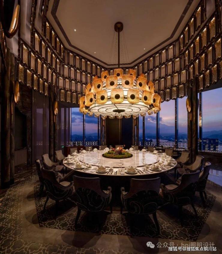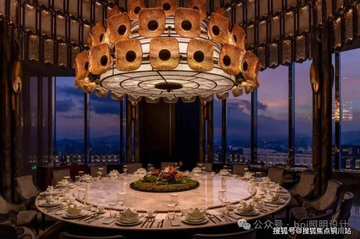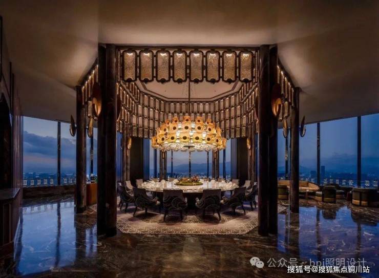 Following the winding circulation path, private dining halls facing the river view unfold in sequence. In the largest room, luxurious stone columns frame an octagonal pavilion layout, with a triple-glazed "Phoenix Feather" lantern suspended at its center. Light filters and refracts through the glazed glass, casting a solemn yet rhythmic tapestry of light and shadow across the space.