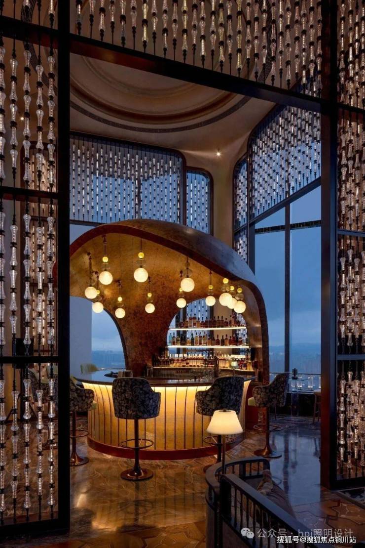 水晶吊饰组成的光影隔栅巧妙划分区域,却保持视觉的连贯。中央贝壳造型吧台上方,珍珠式样吊灯如星辰垂落,3000K暖色温光源在水晶玻璃的折射下,营造出诗意浪漫的氛围。