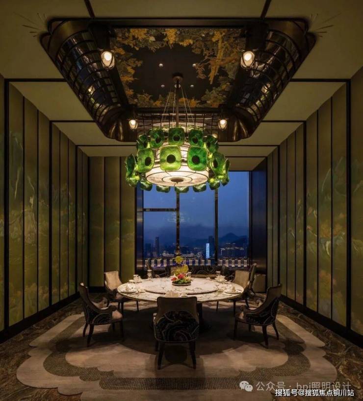 设计师敏锐捕捉材质的灵魂:白昼,自然光透过玻璃,在紫色木饰面上投映出“紫气东来”的意蕴;夜晚,精心调校的灯光让墙上的瓯绣与螺钿镶嵌,闪烁出如星河般的微光,令传统工艺在当代空间中重焕生机。更私密的小厅内,一盏孔雀绿色的琉璃灯与整体色调和谐相融,智能系统轻松切换着不同宴请所需的光影氛围。