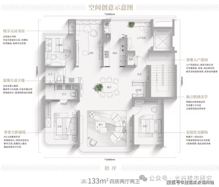 璞拾光屿定位为集“空中园林”“垂直绿化”于一体的第四代住宅,由C、D两个地块组成,C地块容积率2.27(323户),D地块容积率1.98(520户)。每个户型均配备入户花园**,高层住户可在家门口养花种草,享受“空中园林”体验。