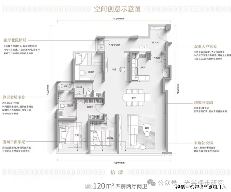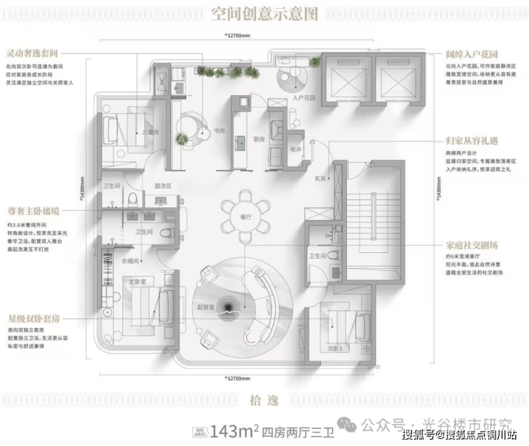 【户型矩阵】 面积跨度100-169㎡,涵盖三房两厅两卫、四房两厅两卫、四房两厅三卫等户型。主力面积118-143㎡,得房率最高达117%。169㎡四房三卫户型采用“U型”全景窗设计,大面积玻璃搭配弧形元素,可将周边公园景观与城市天际线尽收眼底。项目为精装修交付,具体标准尚需进一步核实。