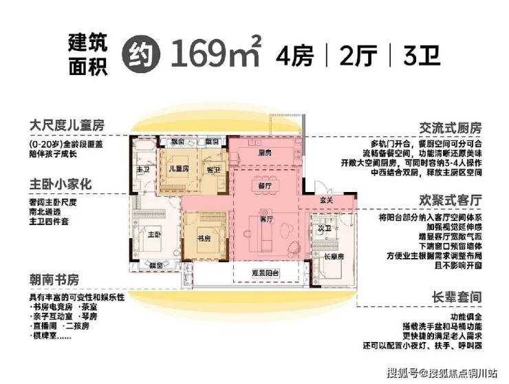 建面约169㎡户型采用LDKB一体厅+南向双套房布局,拥有比肩建面约200㎡的空间感,给业主带来“跃级”居住体验。