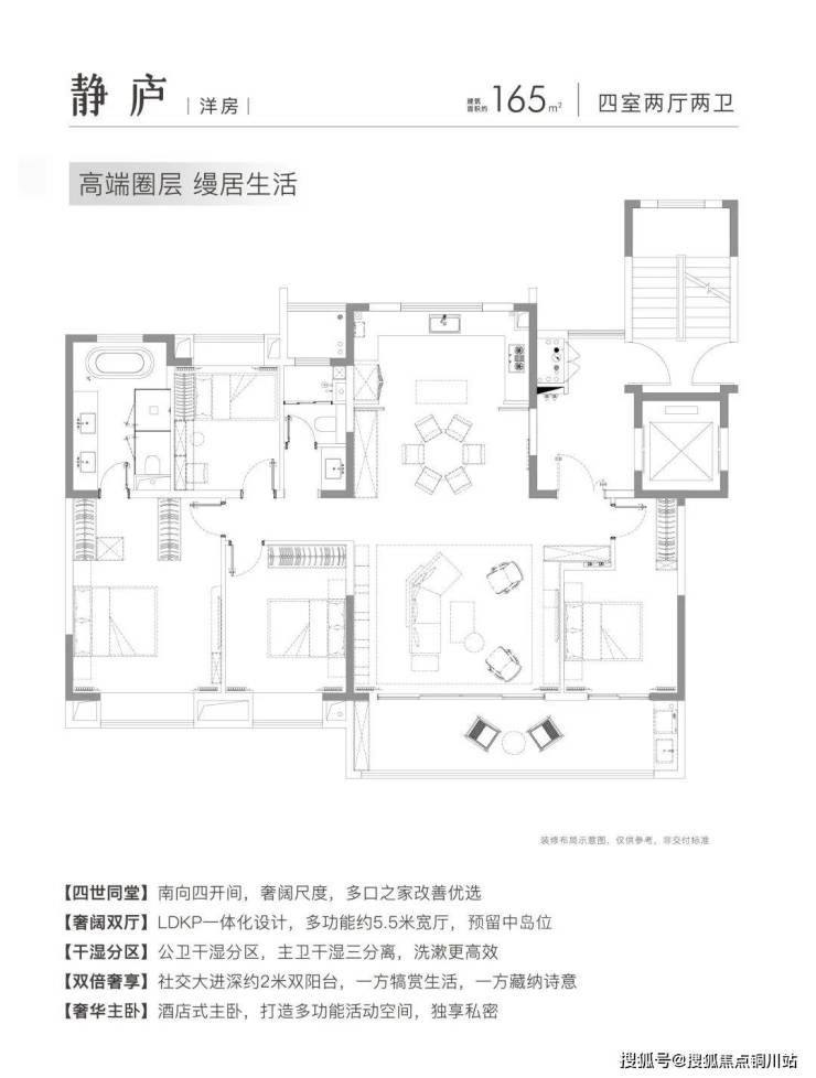 以建筑面积约165㎡洋房户型为例,主卧开间高达约4米,进深约5.2米,空间阔绰,一般项目200m²主卧开间也仅4米左右。可媲美别墅的空间尺度,让生活愈加舒适;南向飘窗设计,将窗外景观尽收眼底,给予生活更多想象的空间;主卫干湿三分离,设置双台盆,使您的生活更显尊崇,不再担心打扰,不再忧虑时长,化妆、洗漱、沐浴随心所欲。