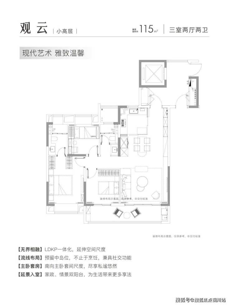 除此之外,观山樾在产品设计过程中,还考量家庭交流、共聚的时间,将客(Living room)、餐(Dinner)、厨(Kitchen)、阳台公共空间(Play)融为一体,打造LDKP一体化设计,营造更宽阔的互动和社交空间。