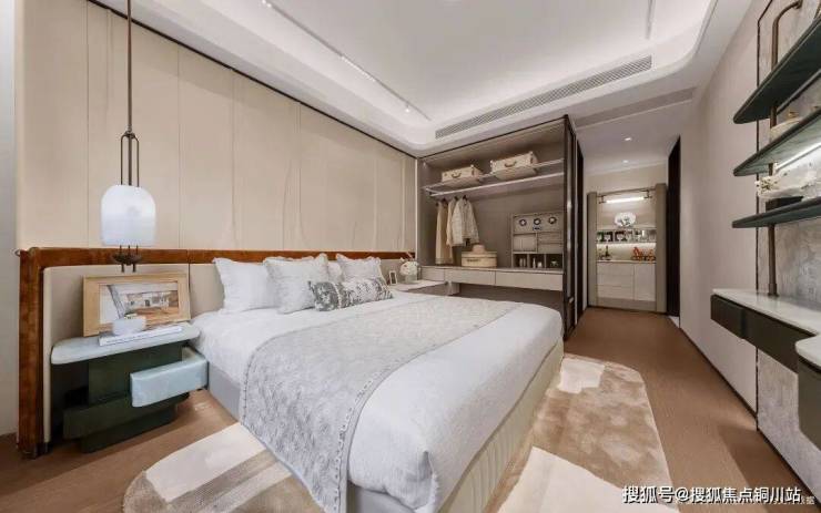 主卧进深约4.1米,主卧体系功能强大,完美实现 “2个床头柜+约1.8米大床+书桌” 的完整配置;