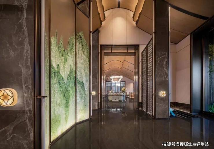 一进门・入境《千里江山图》。大门以《千里江山图》为灵感,采用宋制门堂对称格局,重檐坡屋顶展现极高规制。含两侧景墙总长约63米,两侧全冠移植的罗汉松与镇宅石麒麟,气势恢宏。