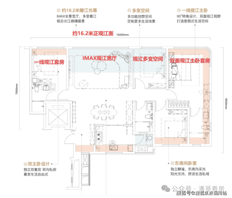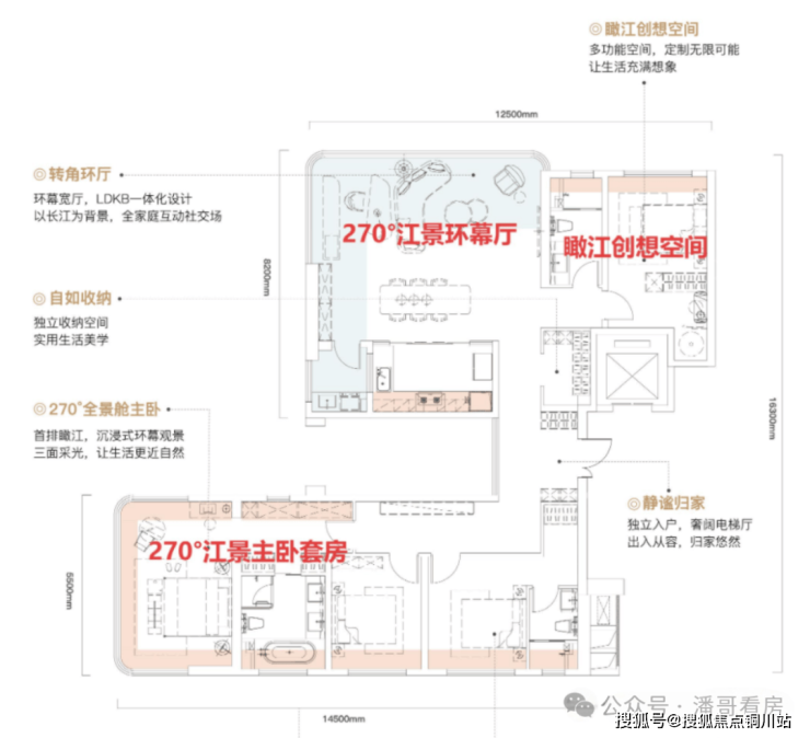 它采用创新“双全景舱”概念设计,实现约45㎡超大IMAX环幕厅,一线江景尽收眼底,搭配约2.5米高落地玻璃,模糊室内外界限;主卧采用270度U型玻璃幕设计,实现观江视野最大化。可改三套间的设计满足高端客群的私密生活享受,入口处设计创新X空间,实现高端品质生活场景演绎。全风雨连廊归家:项目整体设计约4000㎡的风雨连廊和架空层空间,从社区主入口至单元门厅,高定品质归家动线,四季皆有绿意相伴。