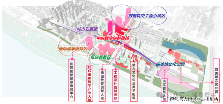 在片区中部,聚焦区域龙头企业——铁四院,依托其核心业务的数智化及低碳化转型升级机遇,打造数智轨交工程引领区,并向滨江地带延伸,形成中央数字创新极核及低碳数智区,共同构建片区垂江产业主轴。