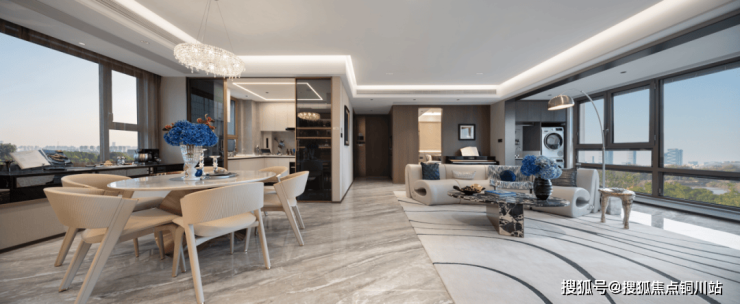 将客厅、餐厅、厨房、阳台四大功能空间无界融合,形成一个通透、流畅的超级厅堂;约58㎡的“双洄游动线”激活空间潜能,赋予生活更多的可能。这不仅是对物理隔阂的打破,更是对家庭互动模式与高端社交场景的重构。