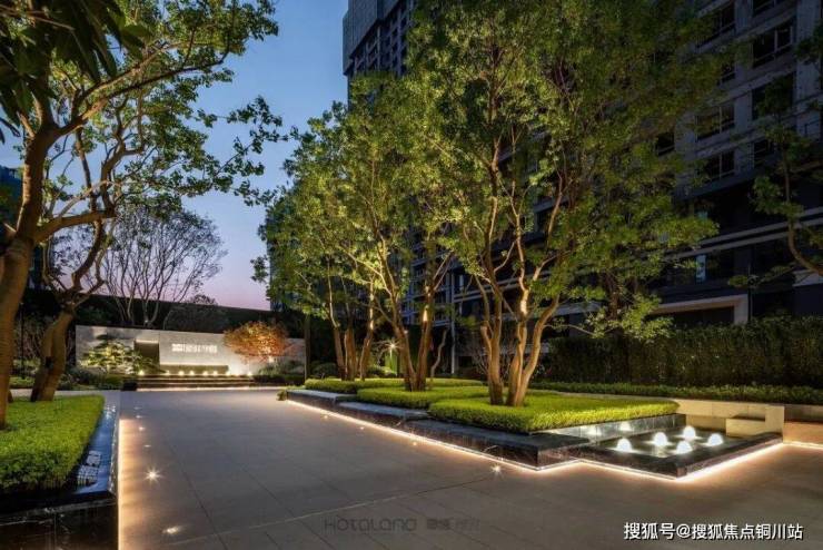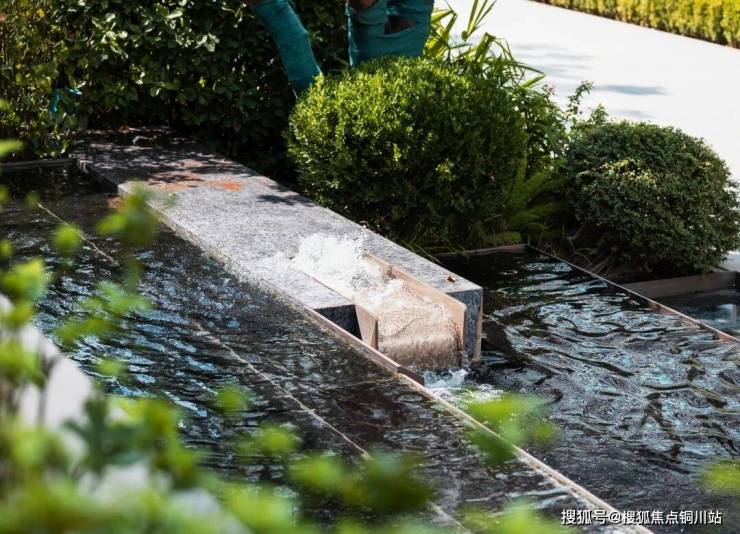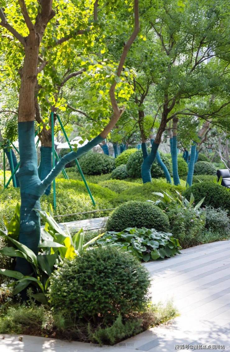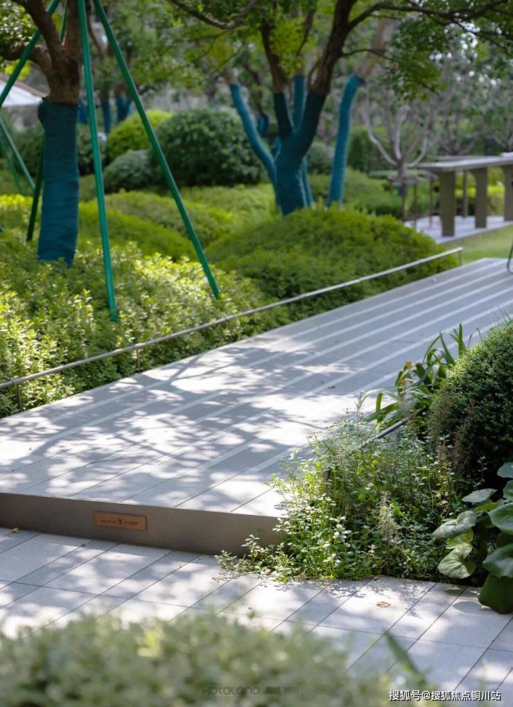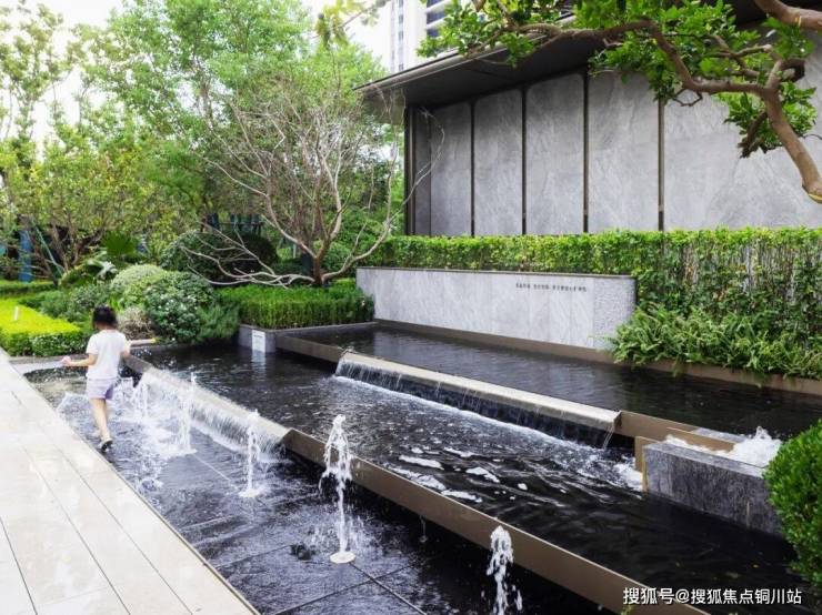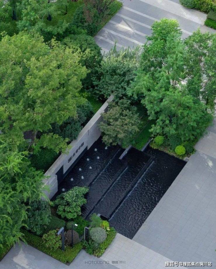 中轴对称的丛生乌桕列阵而立,其下黑色石材座凳静默延伸,将自然的庄重与人文的栖居融为一体。轴线尽头,跌水轻击石板,景墙如静立之屏——一侧红叶灼灼似火,一侧造型松枝舒展如迎,在光与影的交织中勾勒出一幅流动的画卷。这一刻,艺术与自然相融,时光与空间共鸣,开启了心归宁静的诗意旅程。