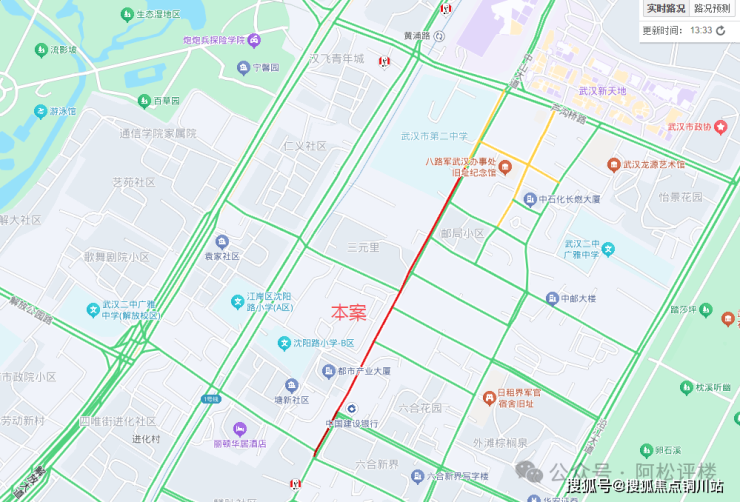 自驾:从路况图来看,该项目周边主次干道路网发达,紧邻京汉大道、中山大道等,因为日常交通流量极大,拥堵情况比较常见。周边次干道路边临停非常多,也有不少是单行线,包括附近的中山大道。