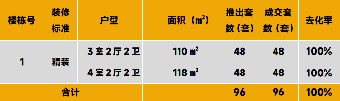 认购去化:2025年5月24号共96套房源全部已售,首日去化率100%。户型面积110-118㎡住宅。