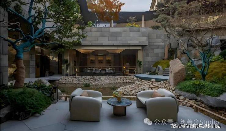 借鉴了名园造园的手法,将江南园林中的庭、廊、桥、坡、台都搬了进来。清溪绕石潺潺流,漾开一池清幽。琼台赏月,浅椅两张,圆几一张,静待君坐。闲坐于此,清风拂过,带来草木清香,听水声潺潺,赏景致怡人,心在此间寻得悠然安宁。