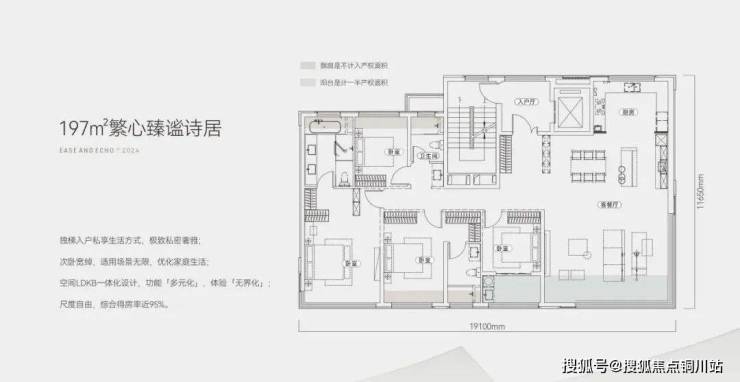 武汉稀缺独梯入户一层一户大平层,11层建筑中,实际仅10套珍稀房源。197㎡宽敞户型,配备四房两厅三卫,独具匠心的双套房布局;南向超宽面达19.1米,四面环绕采光与通风,居住舒适度极佳;阳台深度约2.4米,配备双阳台及多个飘窗,优化空间布局,实现高达95%的得房率,计入电梯前室面积,得房率可逼近99%。