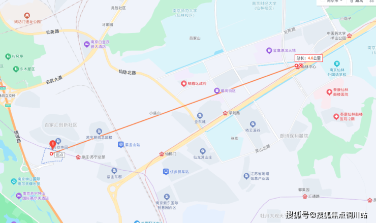 山和月销售自己也说,主要依托的生活设施得去仙林,我们就在地图上拉一下距离:4.6公里,这不开车不坐地铁,基本上简单的生活需求都难以满足——