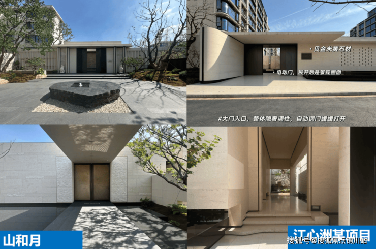其次,作为楼盘的题眼——大门及连廊,山和月也显得和去年的某项目高度雷同,只是细看质感不及对方——