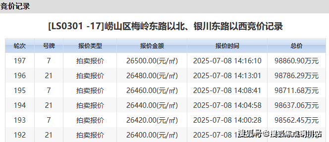 今年7月8日,崂山区王家村LS0301-17地块吸引了海信、君一、华润置地等4家竞买人,经过近5个小时、197轮竞价,最终由君一以26500元/平方米、总价约9.89亿元竞得,溢价率17.8%。这一激烈的竞拍过程再次证明了王家村片区土地的稀缺价值和市场吸引力。