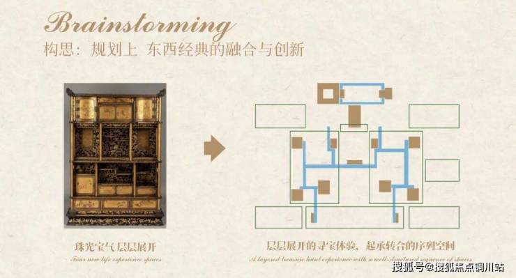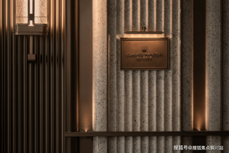 穿过预接待厅,来到礼序水院,两侧的风雨连廊延续至品牌馆,营造酒店式无雨归家的尊贵体验,游园式连廊取意东方园林,中庭以世界奇迹西班牙阿尔罕布拉宫为灵感来源,汲取经典的水台跳泉、修剪绿篱等元素。连廊立面采用海鸥丽晶酒店同款工艺的浅色波纹板石材,配上香槟色金属装饰条,地面采用福鼎黑和芝麻黑组合拼贴成西式文化图案,灯具的造型设计也以弧形勾勒打磨,重现海派文化的经典和时尚。整个庭院融合了东方的意境和西方的秩序,呈现出一种高雅的仪式感。