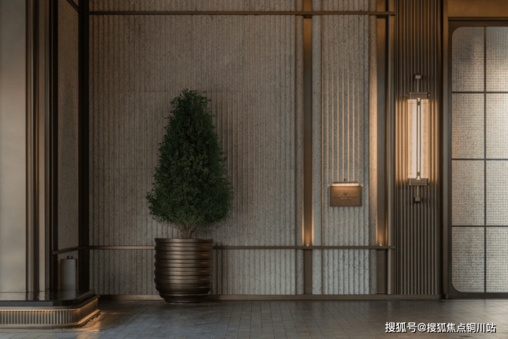 约6米高35米宽的奢华门头+舒适的42㎡车马院落客区,打造酒店式社区归家玄关。入口两侧的矮墙以及大门墙面采用海鸥丽晶酒店同款工艺的浅色波纹板石材,演绎经典地标与现代奢华的碰撞,尽显摩登和傲人。沿街两侧结合矮墙和绿篱设置L形镜面水景,打造业主形象尊贵的归家第一礼遇界面,彰显酒店式尊崇奢华品质。