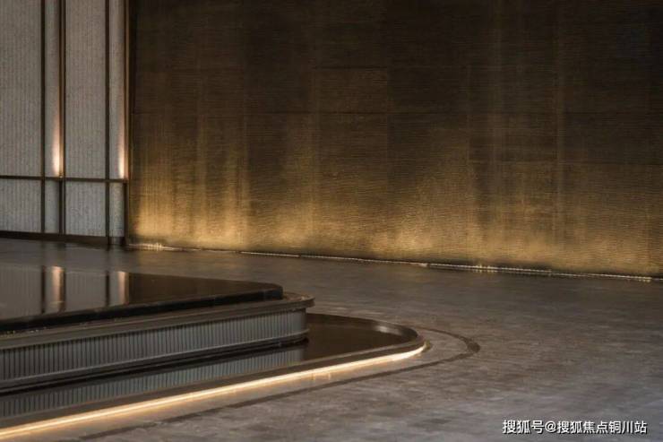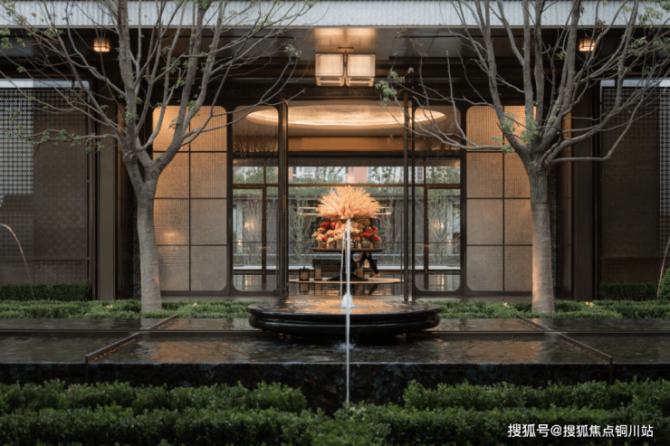 来到仪式水轴,眼前一块长20多米的蓝翡翠奢石水景,奢石如琉璃般晶莹剔透,两侧序列的涌泉演绎生动、优雅、精致的生活场景,给人一种静谧、典雅的空间氛围,彰显着酒店式奢华品质。