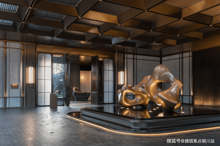 水景中央的雕塑是以东韵西境为基础,从亨利摩尔和太湖石二者中汲取灵感,进行创作而成。