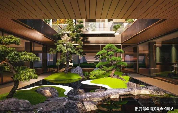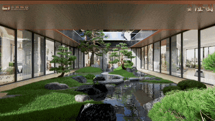 门廊前精心营造的动态山水园林更是点睛之笔——