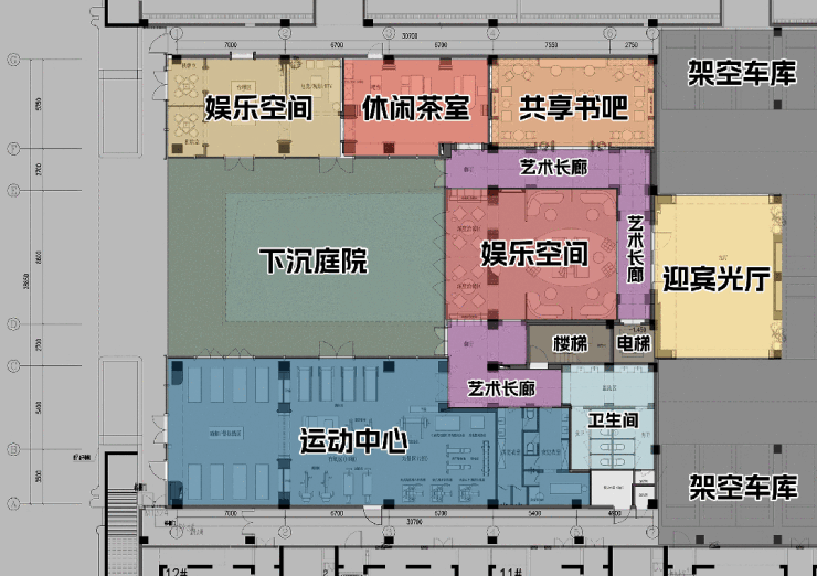 社区大堂吧的背后,还专门设计了一座面积近80㎡、通向架空车库的迎宾厅。