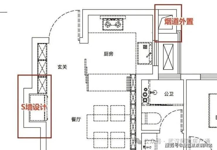 再次,玄关处S墙设计、部分户型烟道外置、更少的承重墙等,业主可根据不同需求设计不同的居住方案。