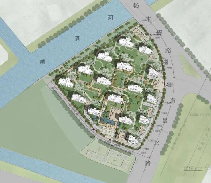 项目选址于三江片区东部的鄞州高新区居住板块,邻近东部新城,靠近甬新河畔。宁波作为长三角南翼的明珠,历史文化与自然生态在此交汇。基地西侧有甬新河,展现水乡与现代都市的融合。项目交通便利,紧邻地铁5号线出口,周边有主干道,自然河道景观优美。海晏天珺作为保利在宁波的豪宅项目,旨在引导雅奢生活方式,将城市自然度假的生活状态融入其中。