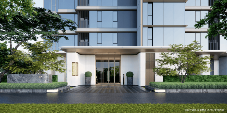 社区主大门采用对称式的八字环抱式盈门,高9米、宽30米,搭配7米超高悬挑雨棚实现酒店式无雨落客,形成壮丽饱满的"名门之仪",给人一种安定丰盈的归家感动。
