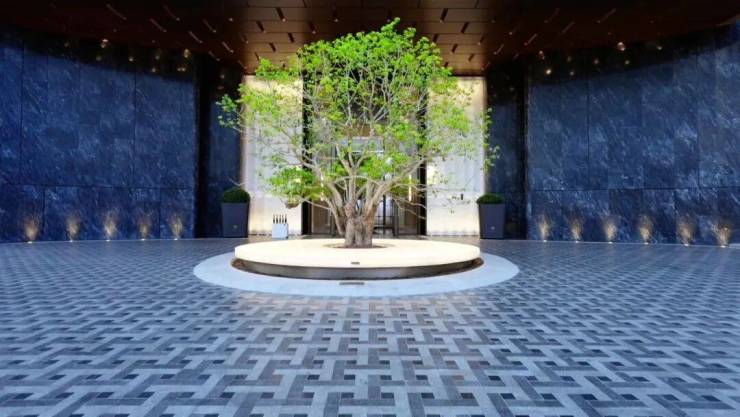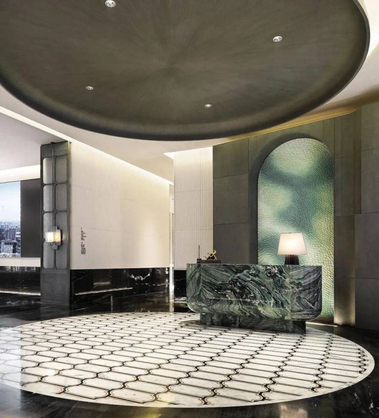 保利·海晏天珺是用室内思维来做户外景观。走进门厅,你会发现他们同样也是用室内思维来做公区设计:大堂地面的玉石铺装,也是编织艺术;地下的下沉式庭院入口的地面玉石铺装,灵感来自宁波当地的「竹编」与「天一阁」窗花元素。