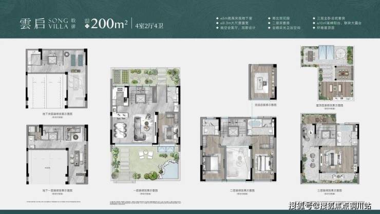 最后来说说叠墅户型,开发商摒弃市场上5-6层叠加的困局,设计更大化私密尊享空间的4层叠加,上下叠均配地下室,并赠送大面积挑空: