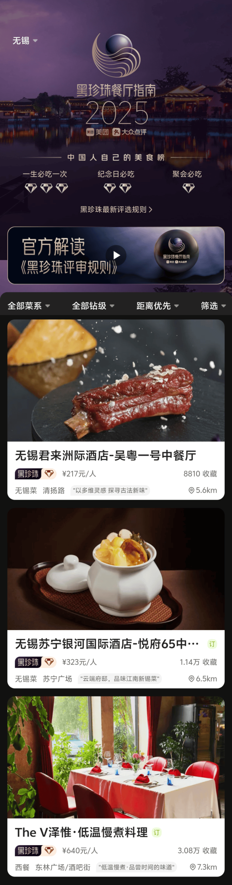 与之呼应的是舌尖上的权威认证, 2024年美团黑珍珠餐厅榜单中,梁溪区入榜3家,占比全市总数75%,悦府65中餐厅、吴粤1号中餐厅、TheV泽惟等名字,已成为高端餐饮的风向标。这意味着,梁溪不仅是购物目的地,更是高品质生活方式的体验场, 每年吸引着超100亿元的消费力在此流动。