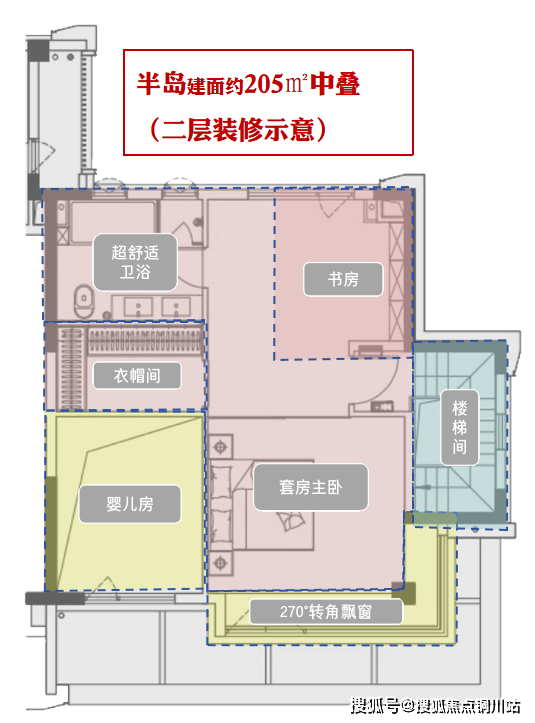 还有近9米的转角阳台,只计算一半的面积,二层270度转角飘窗全赠送……这个建面约205㎡的中叠,实际套内面积可以媲美市面上建面约260㎡的大平层产品。