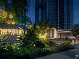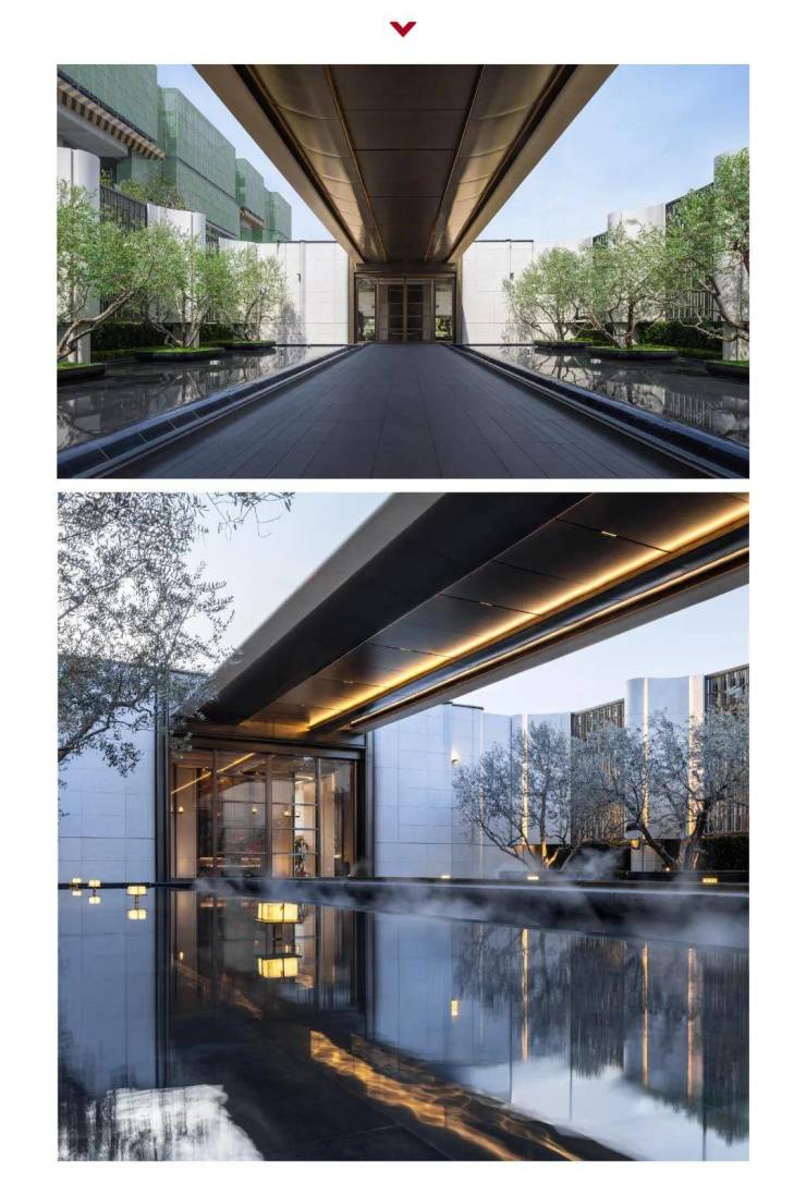 二进院约26米无柱连廊凌空延展,以创新姿态重塑空间美学;两侧迎宾水景打造归家仪式感,结合雾森系统调节局部小气候。