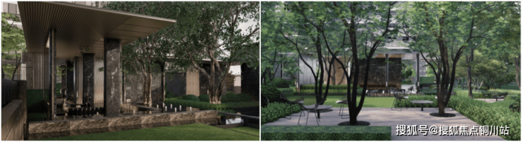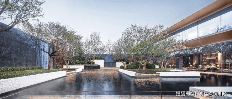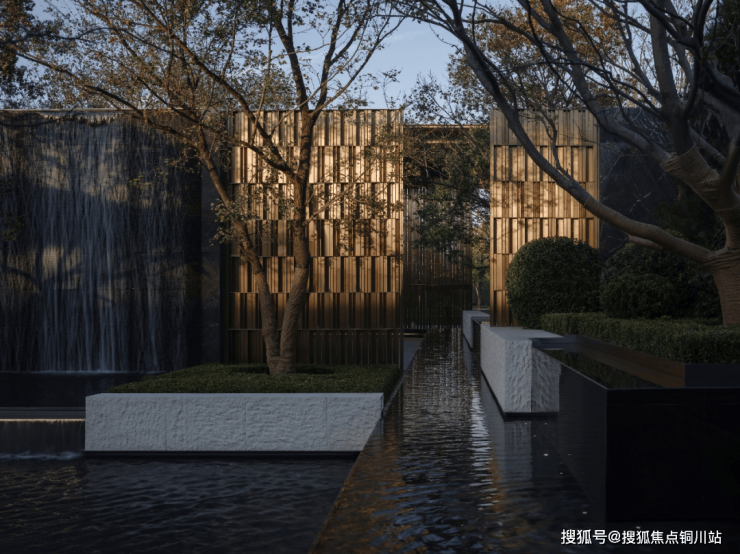 步入示范区园区,景观园林与未来社区园区采用一致性设计手法,颇具巧思的营造园区动线、景观植物、设计符号、高差叠水等细节,塑造出静谧与舒适的园林场景体验。
