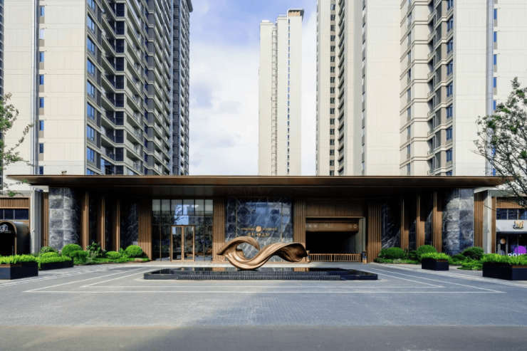 主入口宽幅敞开约40m,挑高拔升至7m,使用“爱马仕灰”石材和香槟金的铝板,强化酒店式落客区的仪式感。